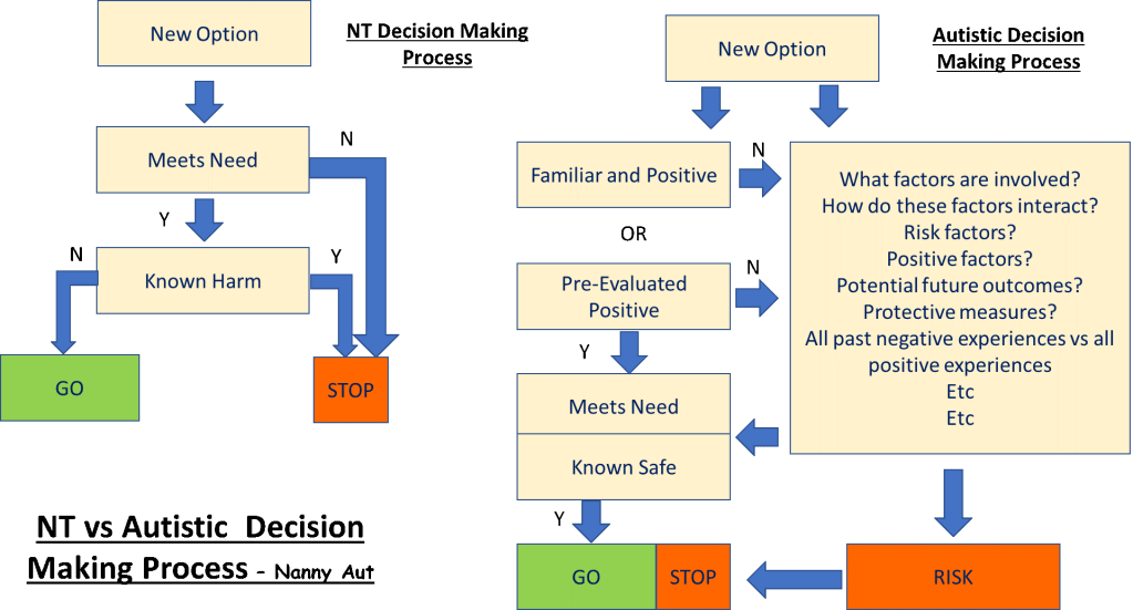 There are several important differences between an autistic brain and an NT brain that affects processing from what we take in, how we process it and how we act on the input.