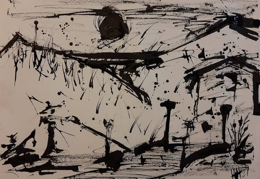 I started by simply making marks on the paper that felt nice, then I joined the marks up, then I saw a vague scene.