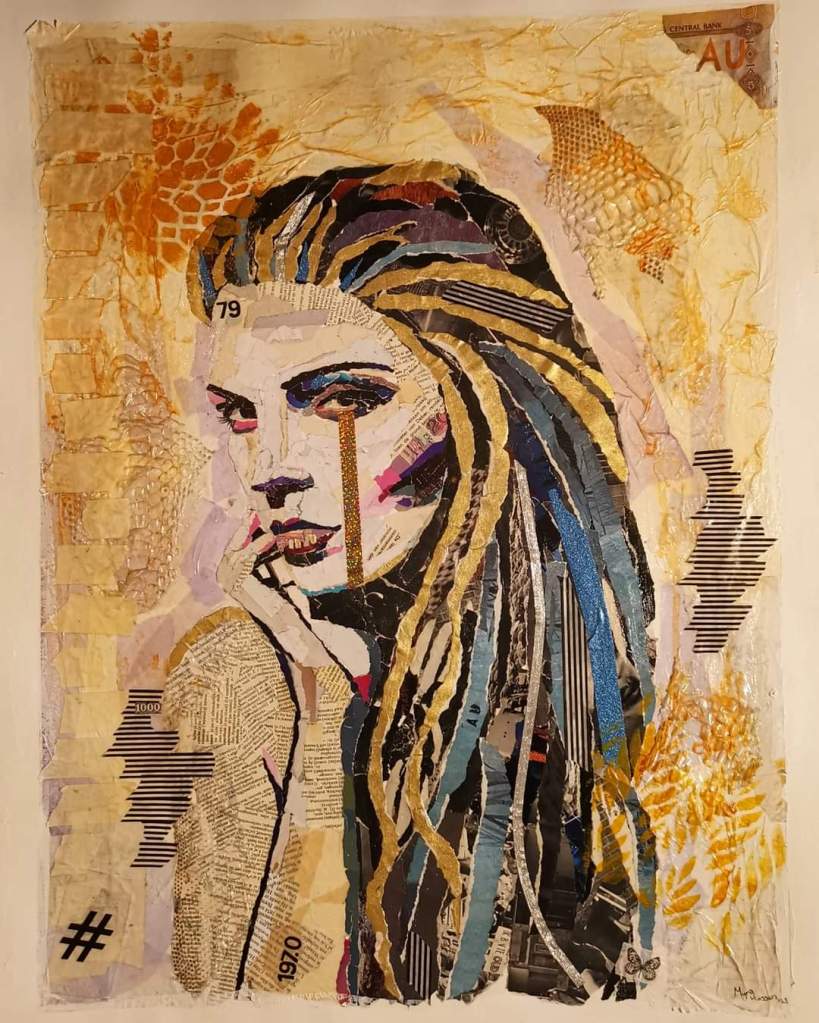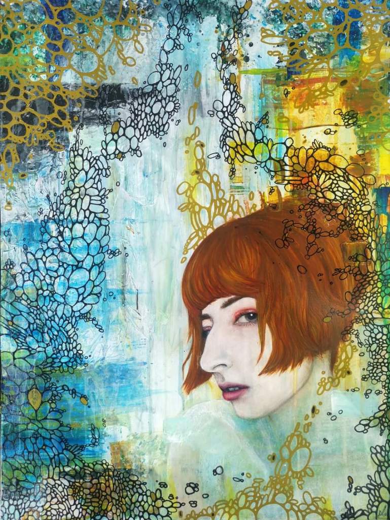 The top portrait showing a girl with short hair is titled “Kate”. It’s a mixed media artwork with mainly acrylic paints. She’s the first portrait in a series I’m working on called “But you don’t look autistic”. I, myself, and a lot of other autistic women, are very familiar with this sentence, and it made me wonder what exactly people think autism looks like… So I started doing a series of portraits of different women on the spectrum, to create awareness that autism and mental health isn’t something you can see on the outside.