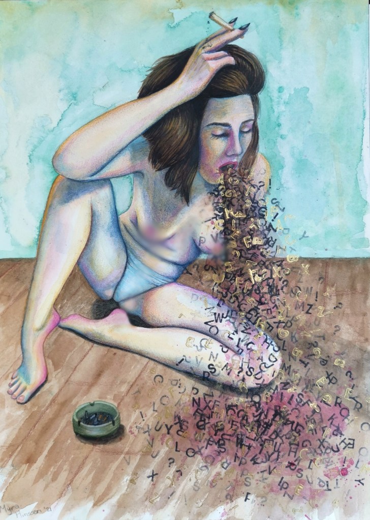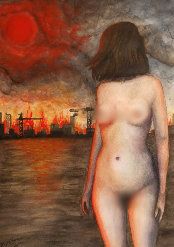 This is a watercolor painting, also a self portrait. It represents my struggle to find the right diagnosis and also fighting to get it officially after I figured it out by myself over the years… Getting my diagnosis felt like I could start over in a way, burning everything behind me, sad and scary but also necessary. The hair in front of my face represents that, even though I know what I don’t want in life anymore, I also can’t see clearly yet where it is going now.